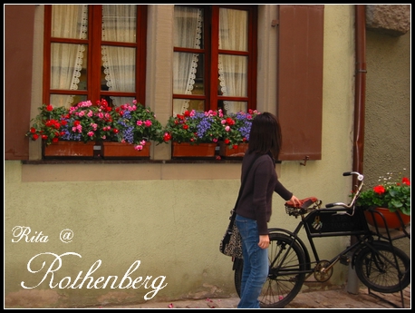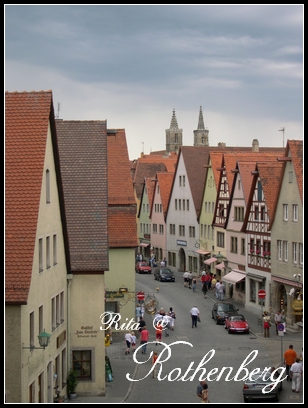 不久,雨停了,我們也走了大半個城牆。我們決定往城裏走,漫步在時而上坡時而下坡的鵝卵石街道上,兩旁的房舍儘是未被損壞的歌德式與文藝復興時代的建築,而這些建築像是說好了似的,相鄰的兩個人家絕對不漆成相同色彩,就是因為這樣的默契,使得到處是色彩繽紛,這大地的色澤像是絲毫不吝惜地,都用在這個可愛的小鎮。