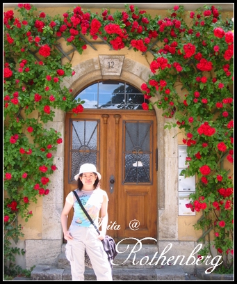 [羅騰堡的玫瑰花美得讓人迷戀,那紅得熱情的玫瑰攀緣於圓拱門木製兩扇門,綠色的葉子又是巧妙的陪襯,真是很美妙的搭配,像是新娘子的夢幻拱門呢!]