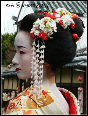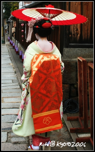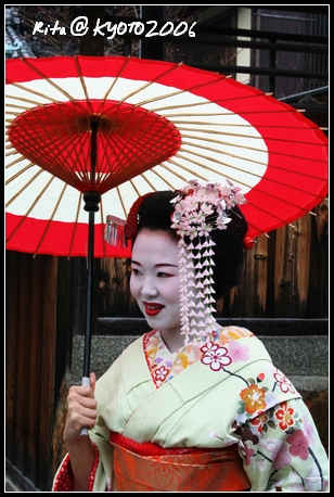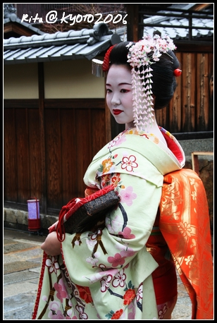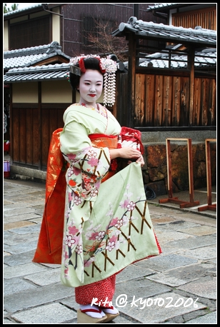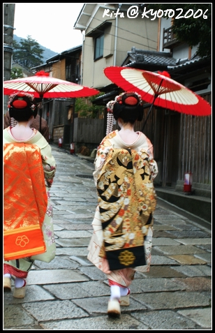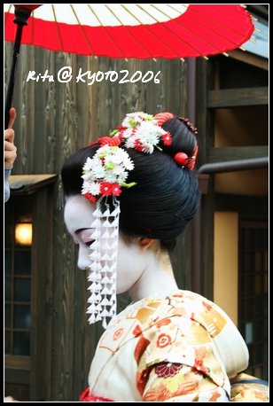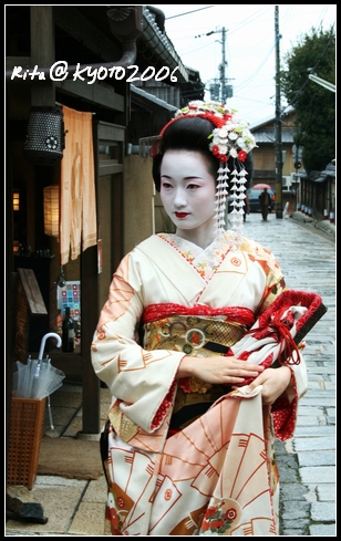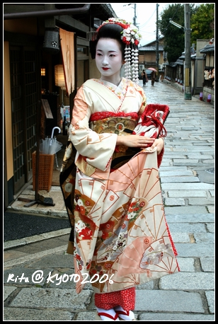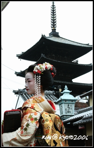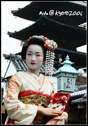 而昨天京都之旅的最後一天,讓我最感雀躍的是,我們竟然在東山八坂塔前巧遇藝妓拍寫真集,專業攝影師所安排的唯美畫面,再加上助理的適時補光,竟讓我也補捉到許多美麗照片,不敢說自己拍得有多美,但這美麗妝扮與幽雅身形的呈現,已讓我十分滿足。